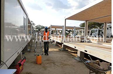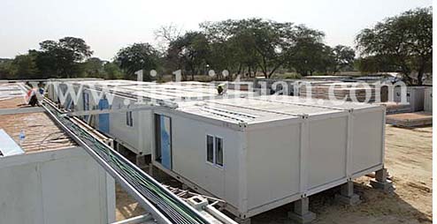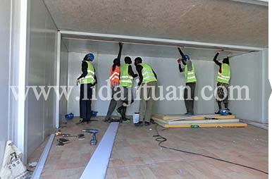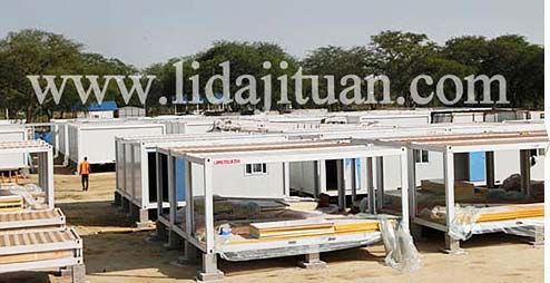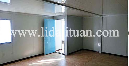 配套建筑部品:本項目用了14個40尺高柜和6個20尺柜拼接組成。外墻噴刷油漆,石膏板內墻(材料可選),鋁合金門窗(材料可選)。